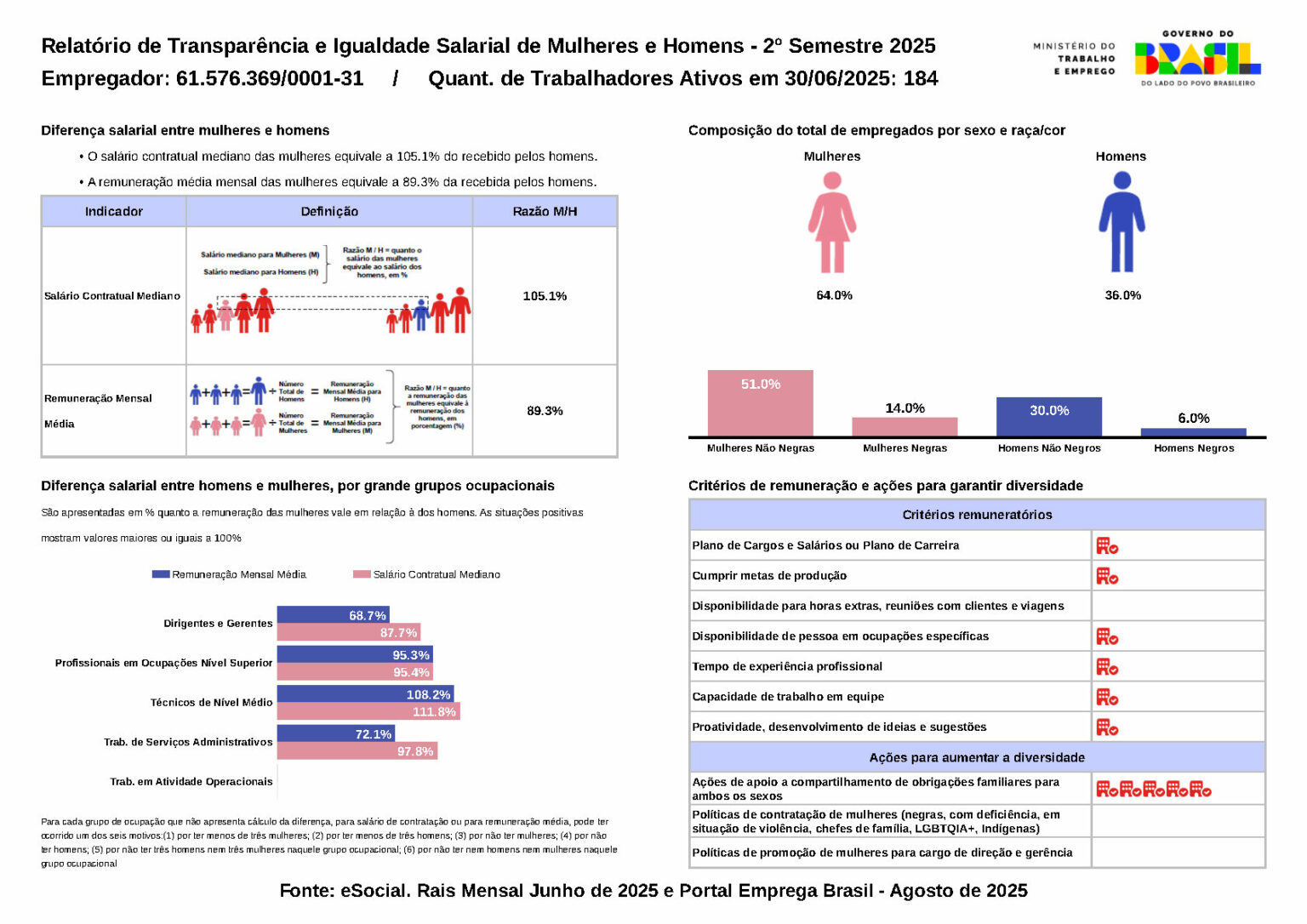 On 1 April 2024, the Ministry of Labor and Employment (MTE) launched the first version of the Wage Transparency Report Panel, an initiative in line with the policy of equal pay for women and men, according to Federal Decree No. 11,795/2023. The MTE has implemented its own methodology for preparing these reports, based on data from eSocial and information provided by companies on the “Emprega Brasil Portal.”