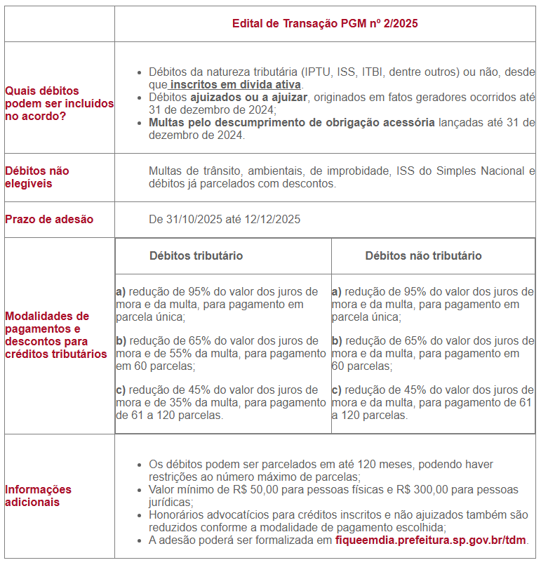 Em 28 de outubro de 2025, foi publicado o Edital de Transação PGM nº 2/2025, que institui o programa “Fique em Dia” para adesão à transação na cobrança da dívida ativa do Município de São Paulo. O programa permite a regularização de débitos tributários e não tributários inscritos em dívida ativa, ajuizados ou a ajuizar, originados em fatos geradores ocorridos até 31 de dezembro de 2024.