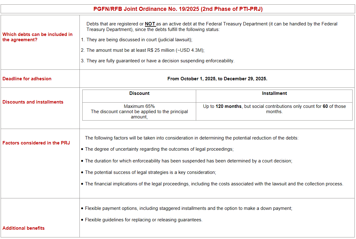 On September 30, 2025, PGFN/RFB Joint Ordinance No. 19/2025 was published. This ordinance deals with the second phase of the transaction in the collection of judicialized credits of high economic impact. These credits are based on the Reasonable Recovery Potential of the Judicialized Credit (PRJ) of the Comprehensive Transaction Program (PTI). This PTI was established by MF Normative Ordinance No. 1,383, of August 29, 2024.