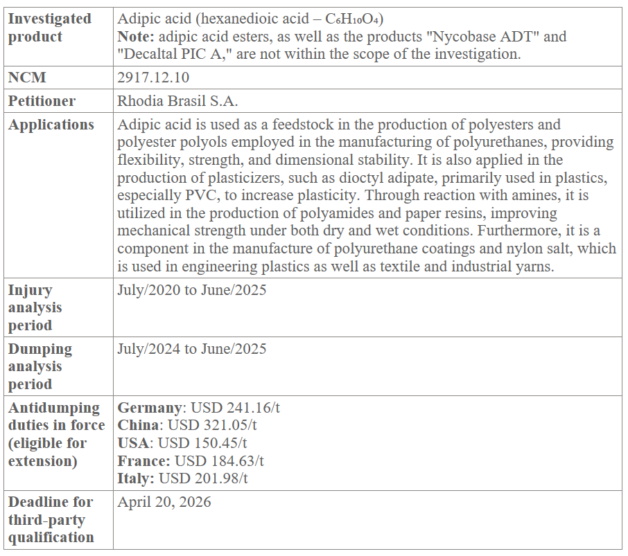 Brazil’s Foreign Trade Secretariat (SECEX) initiated the review of the antidumping measures applied to Brazilian imports of adipic acid (NCM 2917.12.10) originating from Germany, China, United States, France, and Italy.