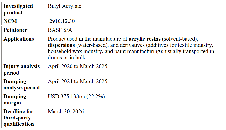 Brazil’s Foreign Trade Secretariat (SECEX) initiated the review of the antidumping measure applied to Brazilian imports of butyl acrylate (NCM 2916.12.30) from the United States.