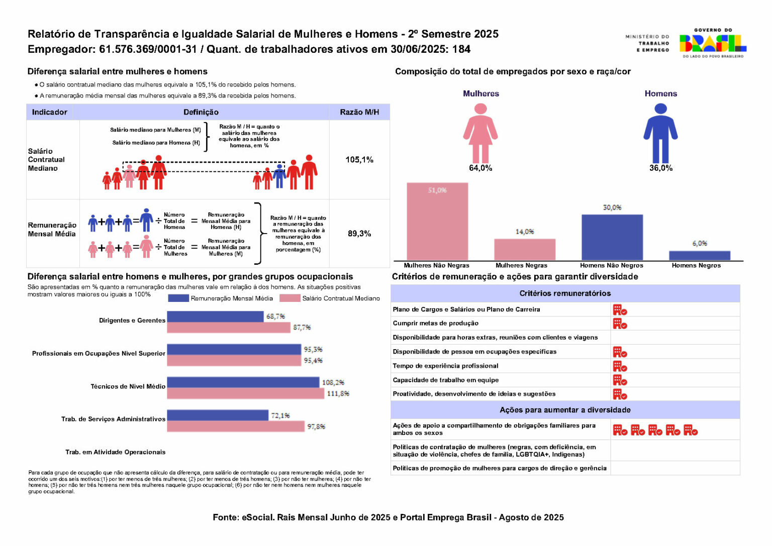 On 1 April 2024, the Ministry of Labor and Employment (MTE) launched the first version of the Wage Transparency Report Panel, an initiative in line with the policy of equal pay for women and men, according to Federal Decree No. 11,795/2023. The MTE has implemented its own methodology for preparing these reports, based on data from eSocial and information provided by companies on the “Emprega Brasil Portal.”