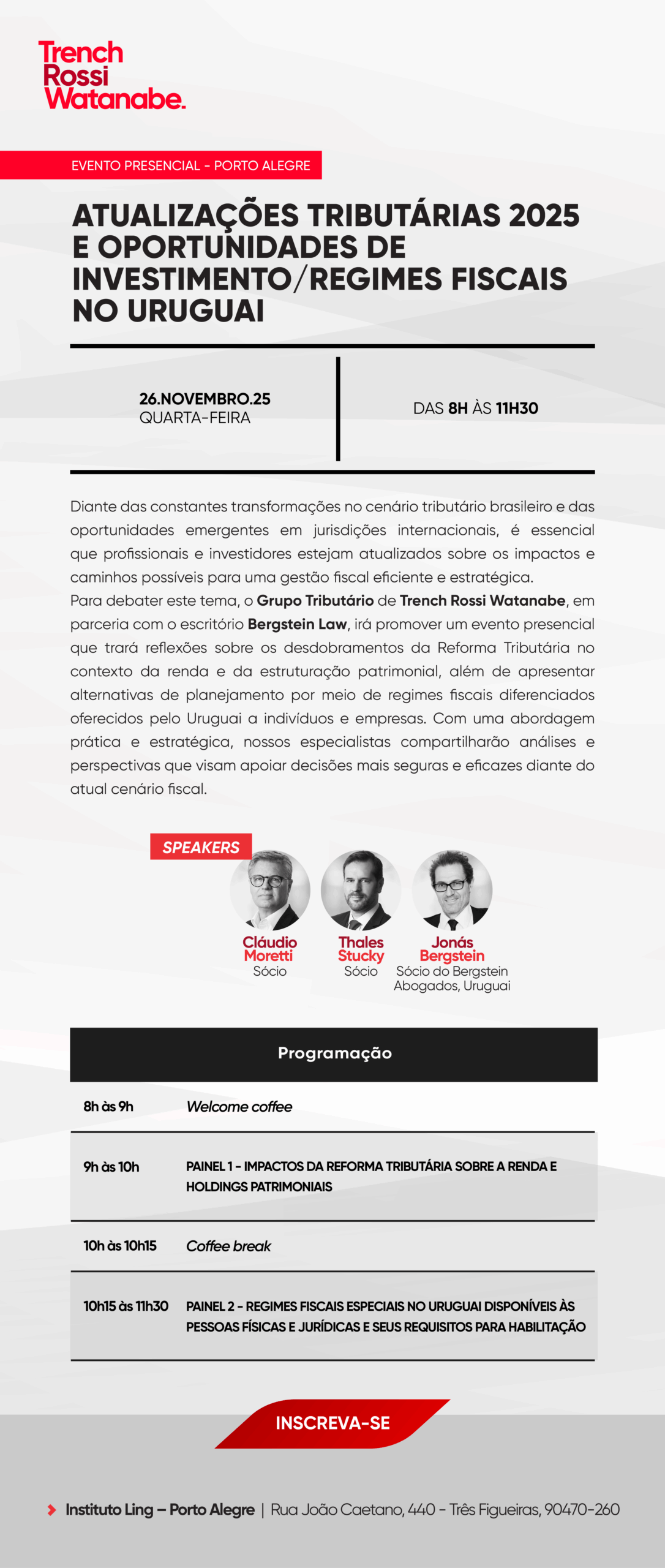 No dia 26 de novembro, das 8h às 11h30, nosso grupo Tributário realiza o evento “Atualizações tributárias 2025 e Oportunidades de Investimento/Regimes Fiscais no Uruguai”. O encontro, conduzido pelos sócios Claudio Moretti e Thales Stucky, conta com a participação de Jonás Bergstein, sócio do Bergstein Abogados, Uruguai.
