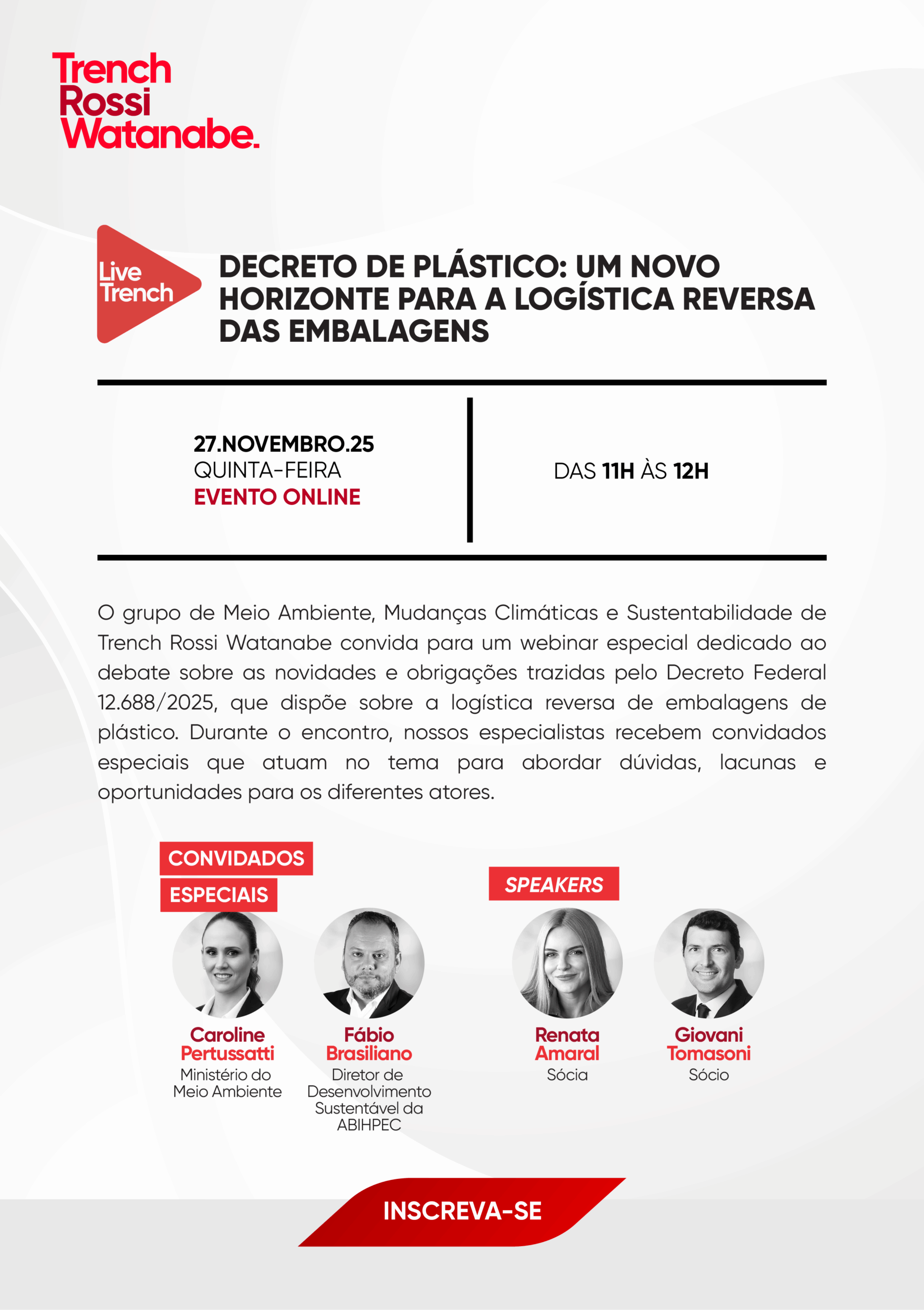 No dia 27 de novembro, das 11h às 12h, nosso grupo de Meio Ambiente, Mudanças Climáticas e Sustentabilidade realiza o webinar “Decreto de Plástico: Um Novo Horizonte para a Logística Reversa das Embalagens”. O encontro, conduzido pelos sócios Renata Amaral e Giovani Tomasoni, conta com Caroline Pertussatti, do Ministério do Meio Ambiente, e Fábio Brasiliano, Diretor de Desenvolvimento Sustentável da ABIHPEC.
