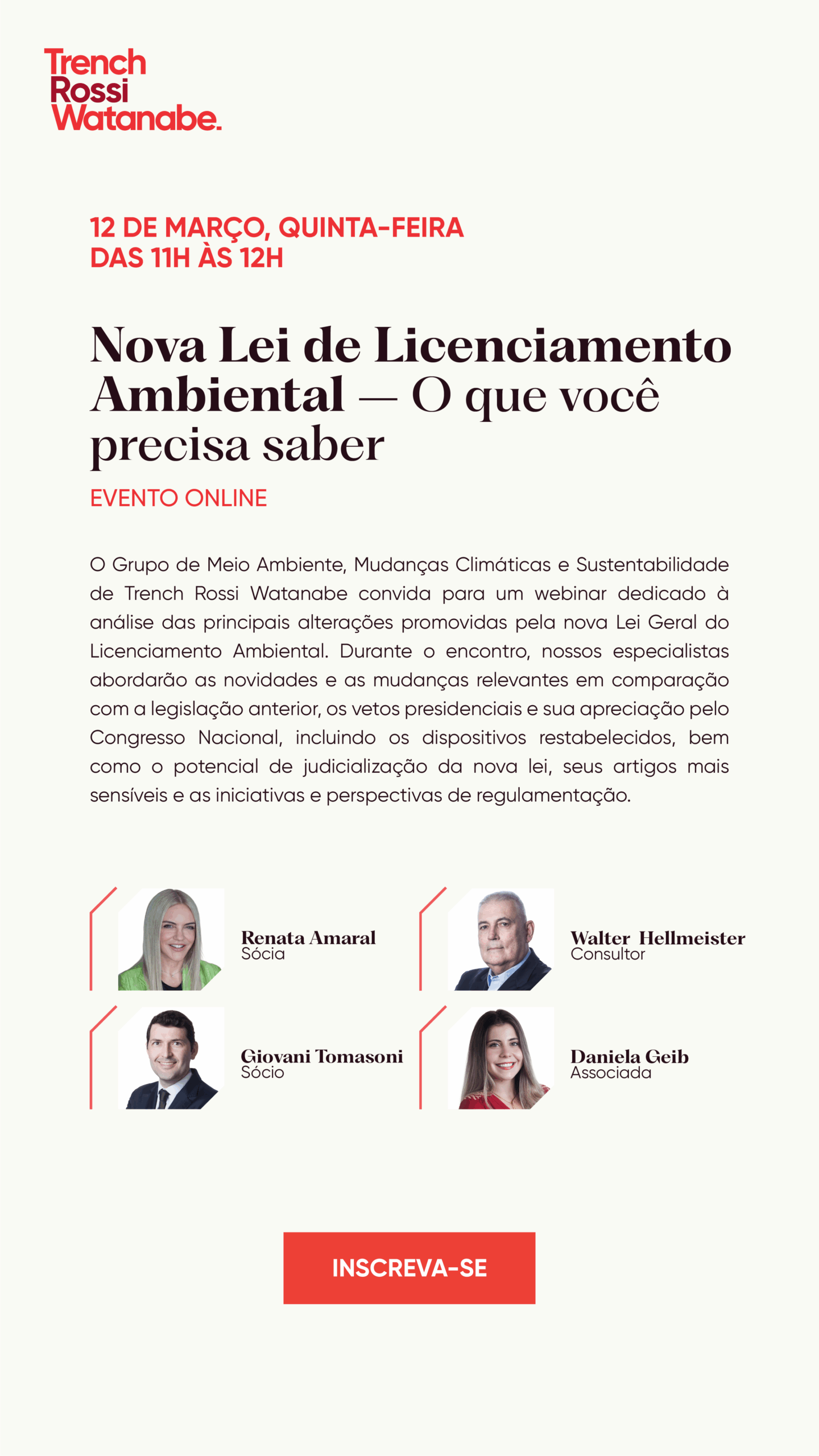 No dia 12 de março, das 11h às 12h, nosso grupo de Meio Ambiente, Mudanças Climáticas e Sustentabilidade realiza o webinar “Nova Lei de Licenciamento Ambiental – O que você precisa saber”. O encontro será conduzido pelas sócios Renata Amaral e Giovani Tomasoni, além do consultor Walter Hellmeister e a associada Daniela Geib.