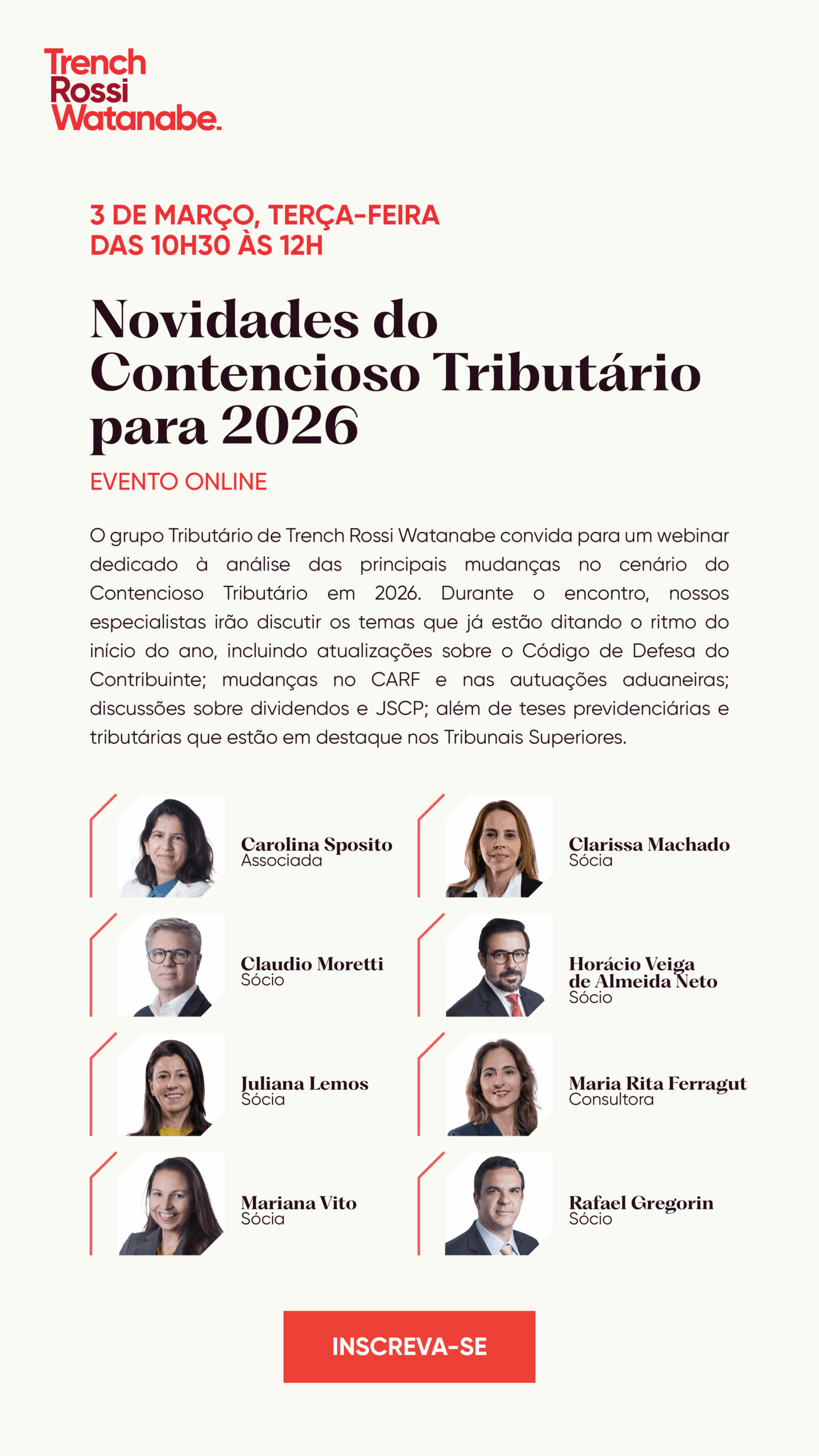 No dia 3 de março, das 10h30 às 12h, nosso grupo Tributário realiza o webinar “Novidades do Contencioso Tributário para 2026”. O encontro será conduzido pelos sócios Clarissa Machado, Claudio Moretti, Horácio Veiga de Almeida, Juliana Lemos, Mariana Vito e Rafael Gregorin, além da consultora Maria Rita Ferragut e da associada Carolina Sposito.
